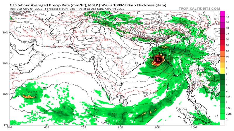 একই সঙ্গে আমেরিকা ও ইউরোপিয়ান ইউনিয়নের আবহাওয়া পূর্বাভাস মডেল প্রায় ৫০ থেকে ৬০ শতাংশ সম্ভাবনার কথা নির্দেশ করছে, যে আগামী ১০ মে আন্দামান ও নিকবার দ্বীপপুঞ্জের দক্ষিণ-পশ্চিম দিকে ঘূর্ণিঝড় মোচা (Mocha) সৃষ্টি হবে।