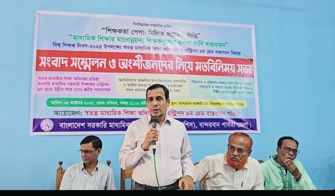 বান্দরবান প্রতিনিধি | বান্দরবান জেলায় সরকারি মাধ্যমিক শিক্ষক সমিতির সংবাদ সম্মেলন ও মতবিনিময় অনুষ্ঠিত হয়েছে। রবিবার (৫ অক্টোবর) বান্দরবান সরকারি উচ্চ বিদ্যালয়ে স্বতন্ত্র মাধ্যমিক শিক্ষা অধিদপ্তর প্রতিষ্ঠা ও এন্টিপদ ৯